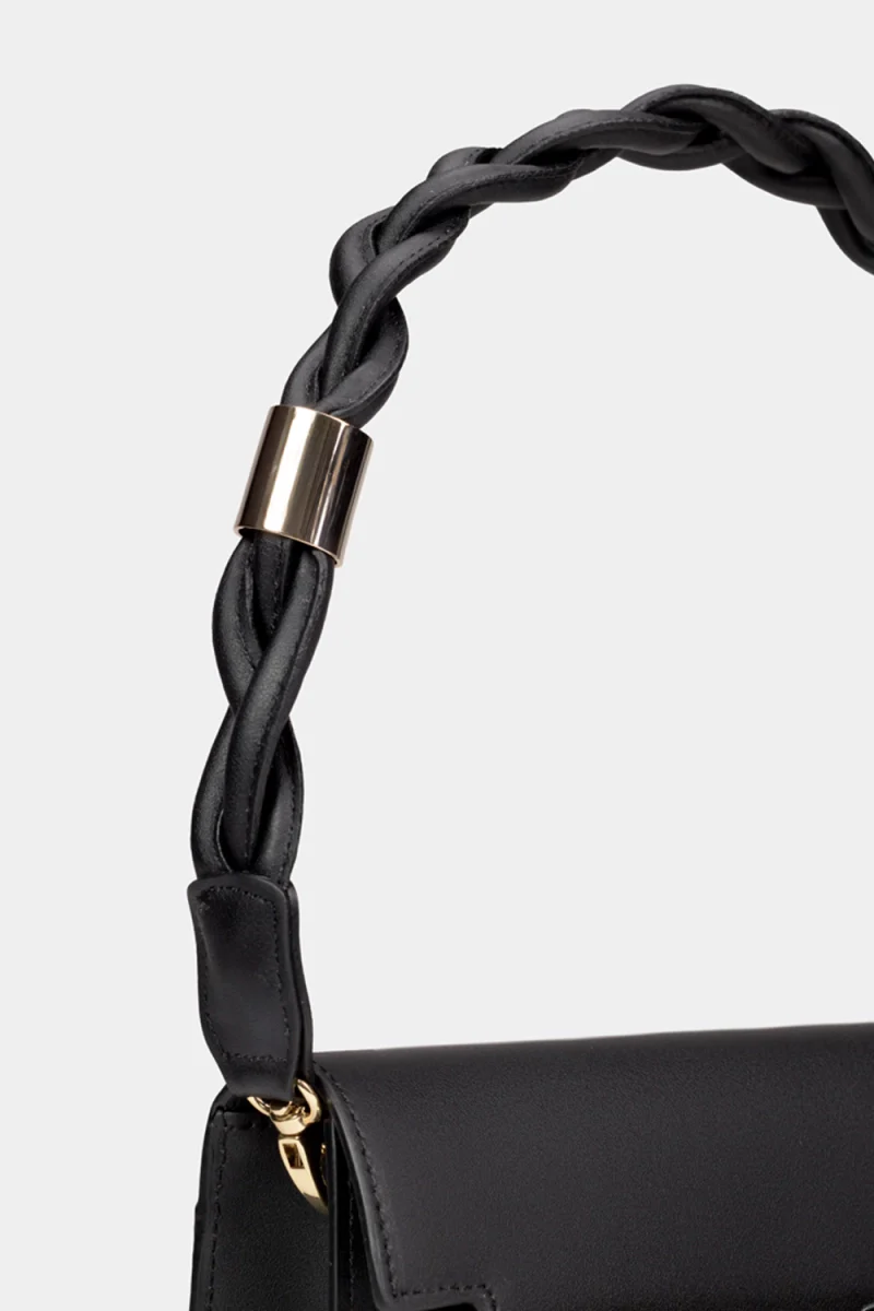 Alanna es un bolso de mano en piel color negro con silueta rectangular definida. El asa superior trenzada en piel, acentuada por un herraje metálico, aporta un detalle distintivo y táctil. Confeccionada con precisión en cada costura, representa una lectura sobria y refinada de la modernidad cotidiana.