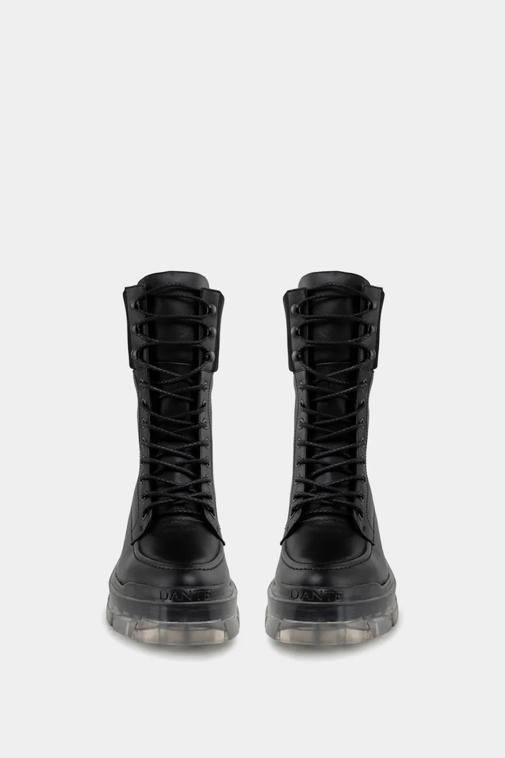 La nueva versión de nuestras combat boots te dejará boqui-abierta. Estas botas hechas en piel color negra a mano y suela transparente hacen de este modelo una creación imparable y completamente adaptable.