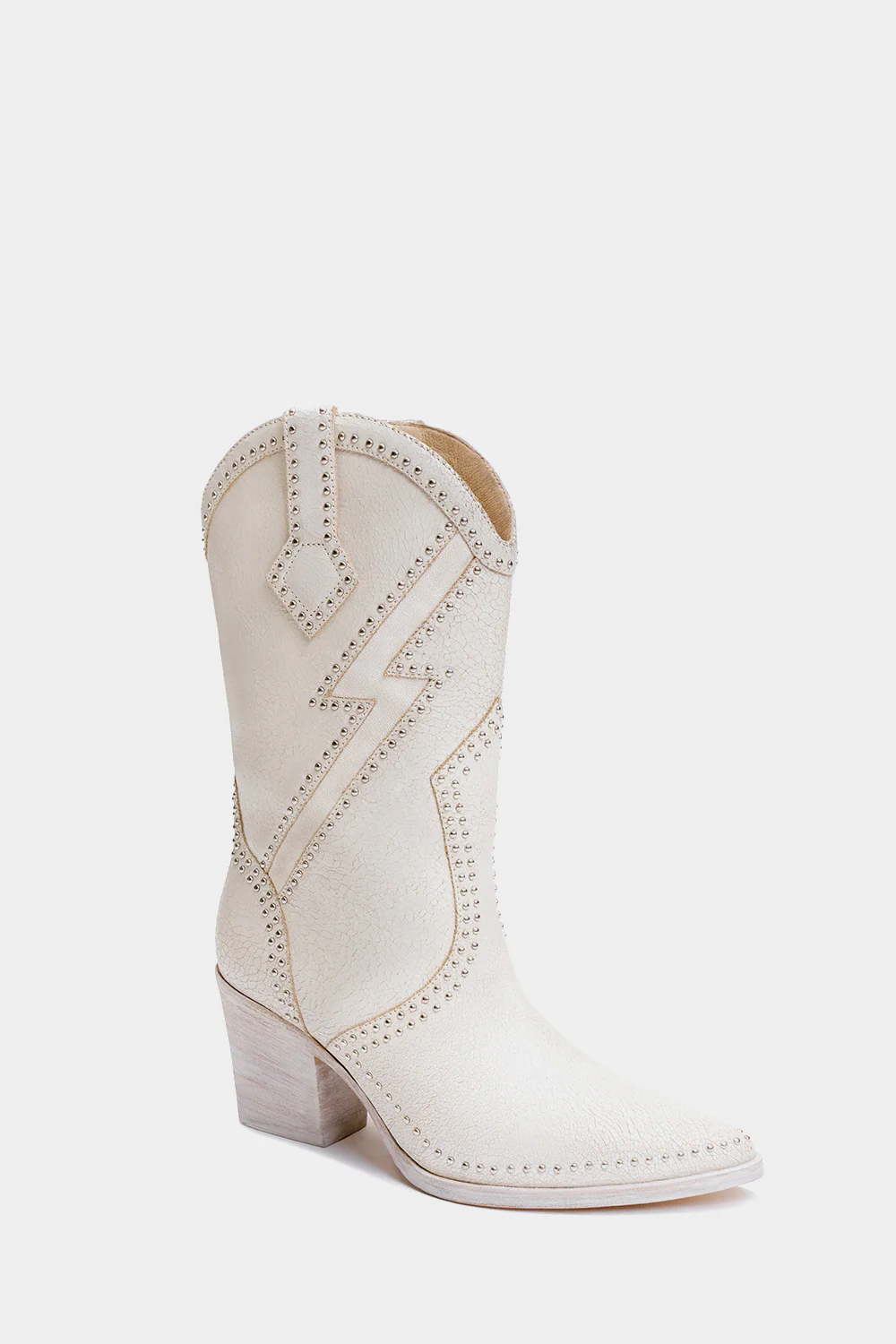 Reinventamos nuestras botas western Freddie Sand, la cual toma inspiración en el rock de Freddie Mercury. Estas botas tonalidad blanca para mujer, están hechas de manera artesanal en piel craquelada. Su diseño vaquero con más de 1,000 tachuelas colocadas a mano es un clásico como lo es Queen.