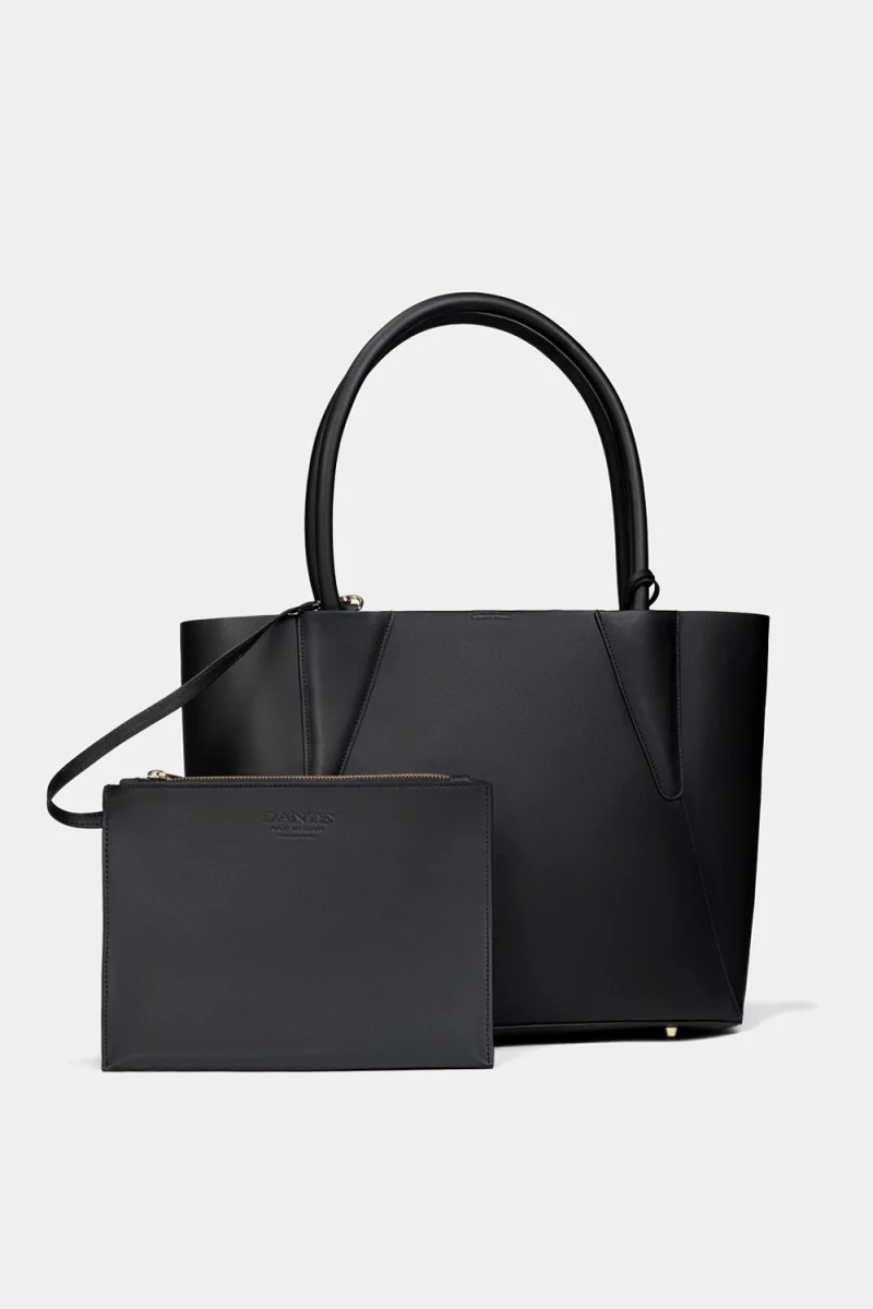 Bolsa tote de piel negra con estructura definida y asas firmes. Incluye pouch desmontable que aporta versatilidad, convirtiendo la funcionalidad en una expresión de elegancia atemporal.