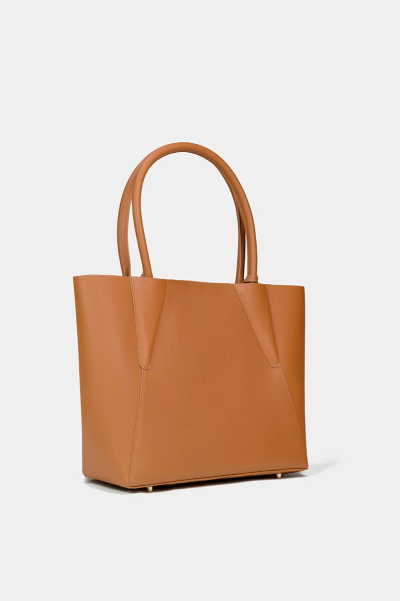 Bolsa tote de piel cognac con estructura definida y asas firmes. Incluye pouch desmontable que aporta versatilidad, convirtiendo la funcionalidad en una expresión de elegancia atemporal.