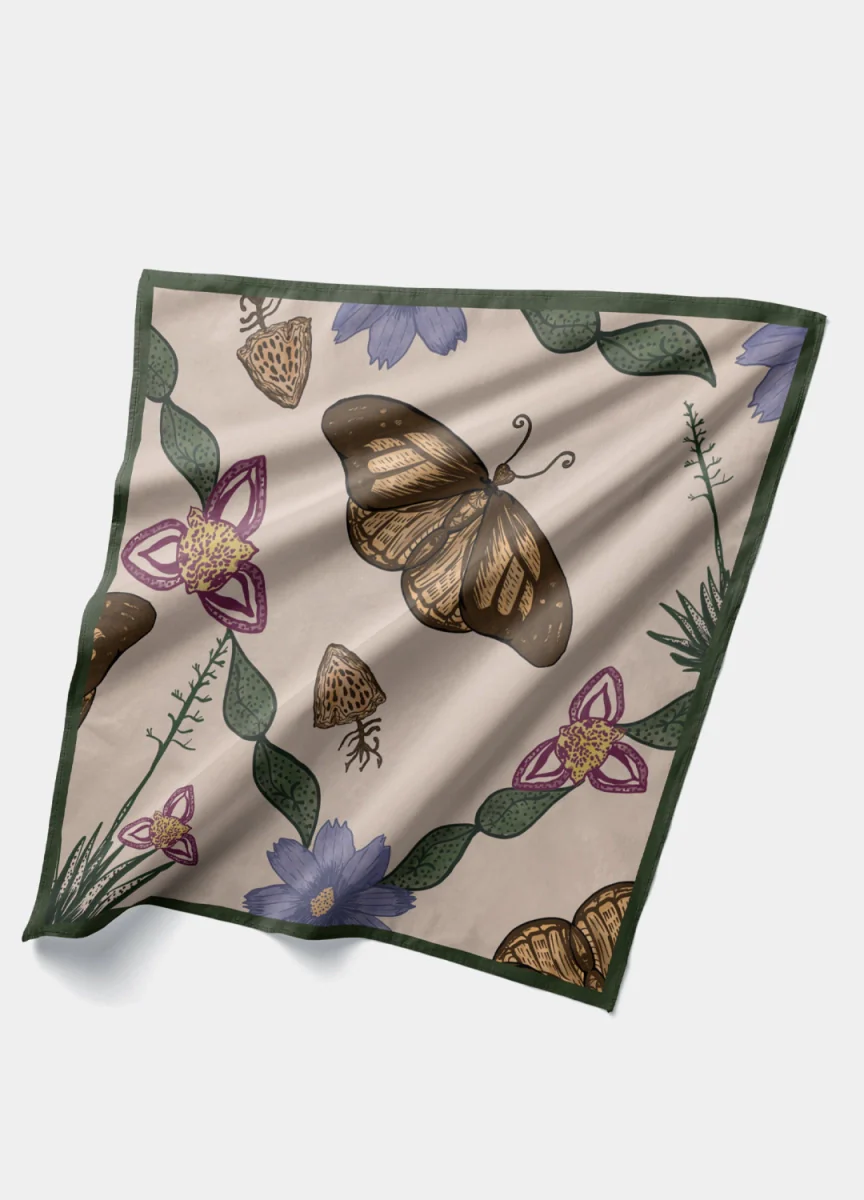 Mascada de diseño elegante con mariposas en tonos ámbar y botánica ilustrada: flores lila, hojas verde profundo y borde verde sobre fondo marfil. El trazo delicado y el contraste medido dan una presencia clara. Pañuelo versátil para llevar al cuello, en el cabello o en el asa del bolso; contemporáneo y fácil de combinar.